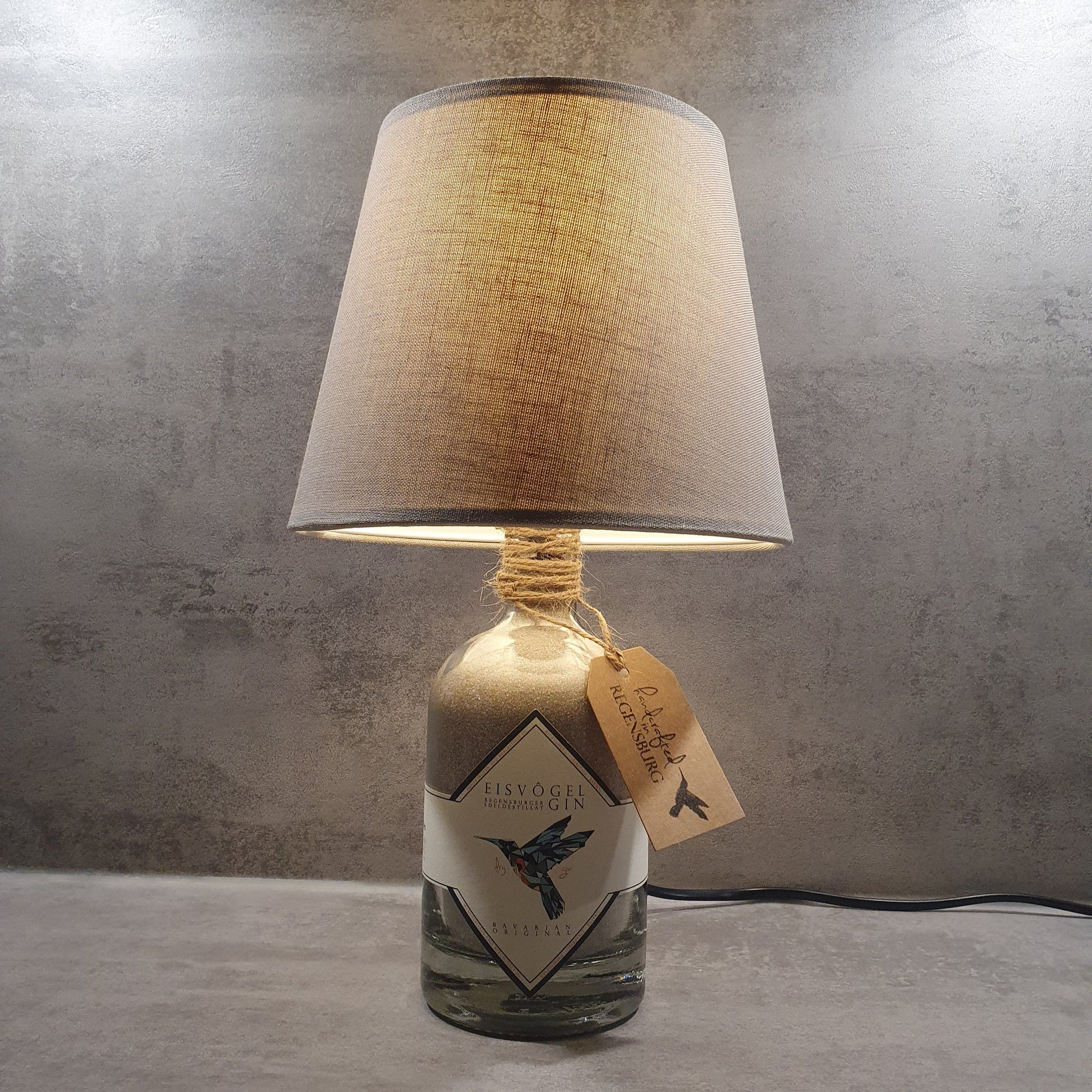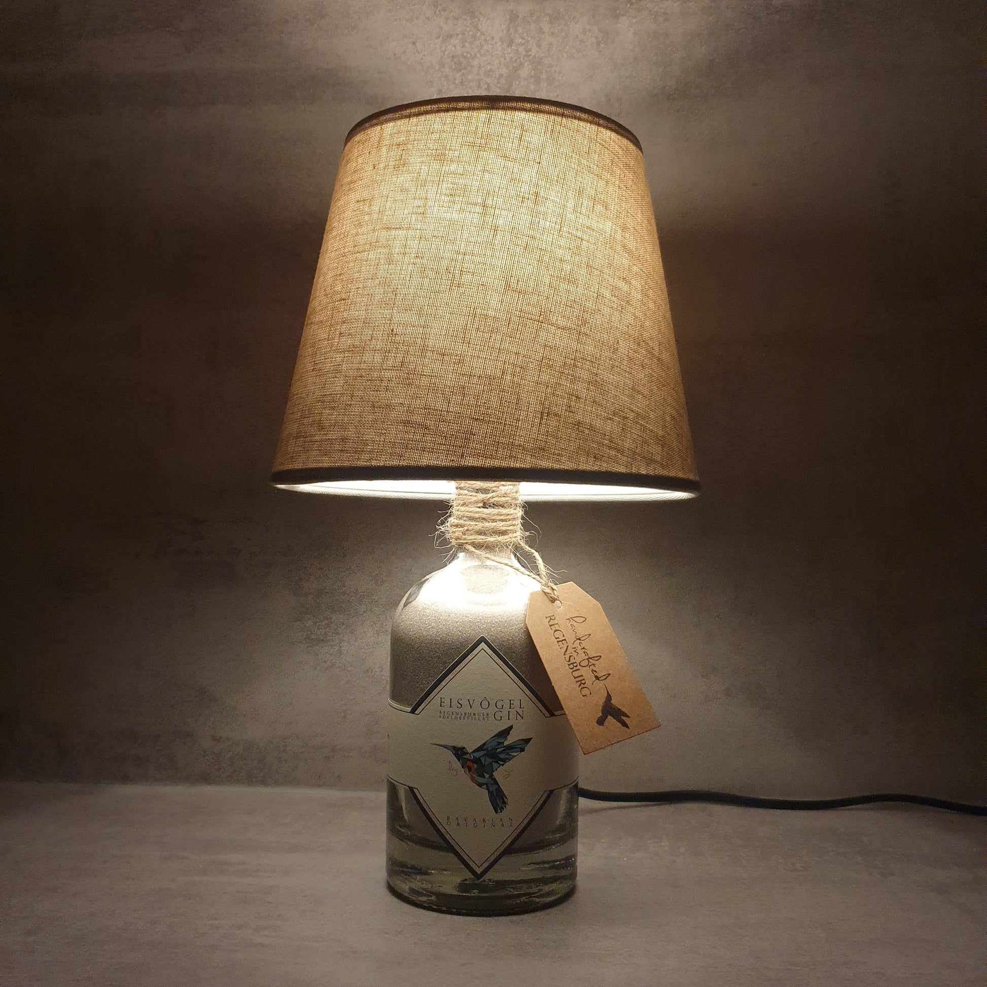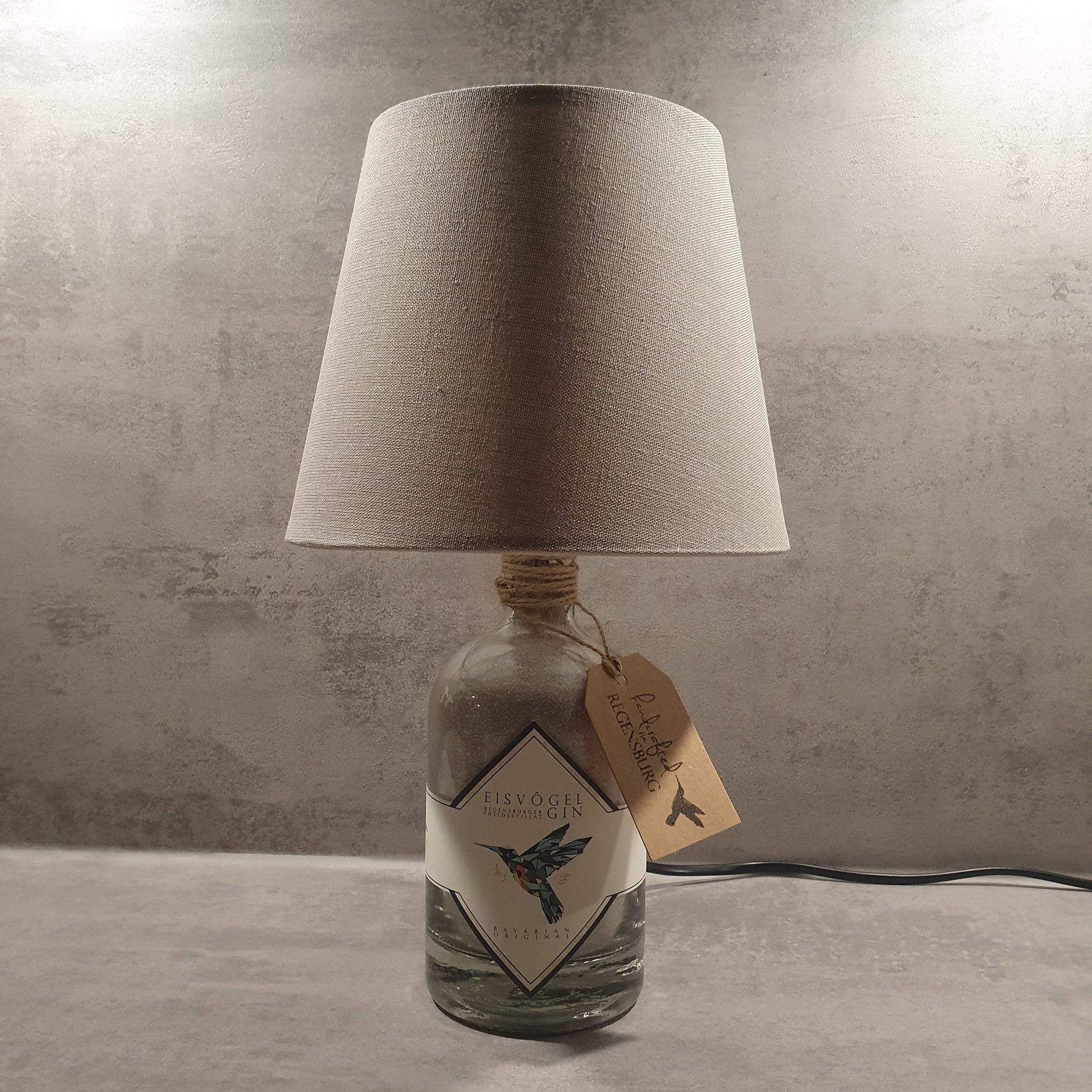 Diese hochwertige Tischlampe wurde liebevoll aus einer originalen Eisvogel Gin-Flasche aus Regensburg gefertigt- ein echtes Upcycling-Unikat für Gin-Liebhaber und Designfans! Jede Lampe ist ein handgefertigtes Einzelstück und ein Blickfang in jeder Einrichtung.